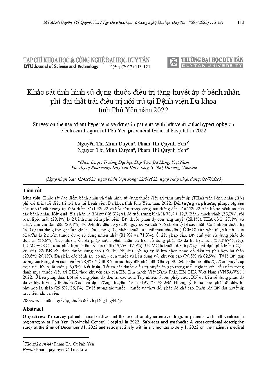 Khảo sát tình hình sử dụng thuốc điều trị tăng huyết áp ở bệnh nhân phì đại thất trái điều trị nội trú tại Bệnh viện Đa khoa tỉnh Phú Yên năm 2022 = Survey on the use of antihypertensive drugs in patients with left ventricular hypertrophy on electrocardio