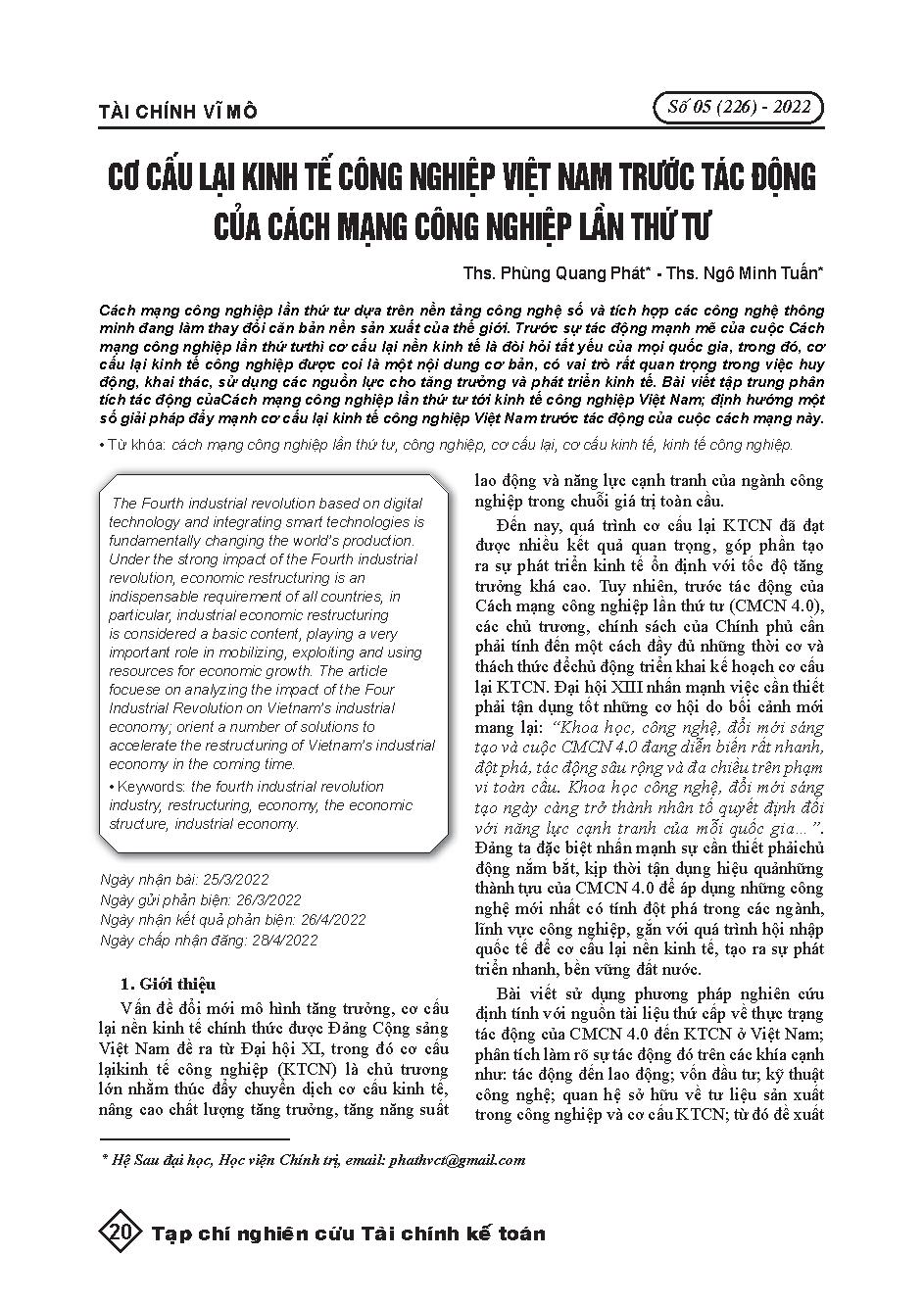 Cơ cấu lại kinh tế công nghiệp Việt Nam trước tác động của cách mạng công nghiệp lần thứ tư = Restructuring Vietnam’s industry in the context of the Fourth Industrial Revolution