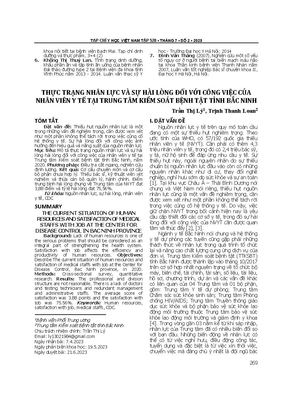 Thực trạng nhân lực và sự hài lòng đối với công việc của nhân viên y tế tại Trung tâm Kiểm soát bệnh tật tỉnh Bắc Ninh