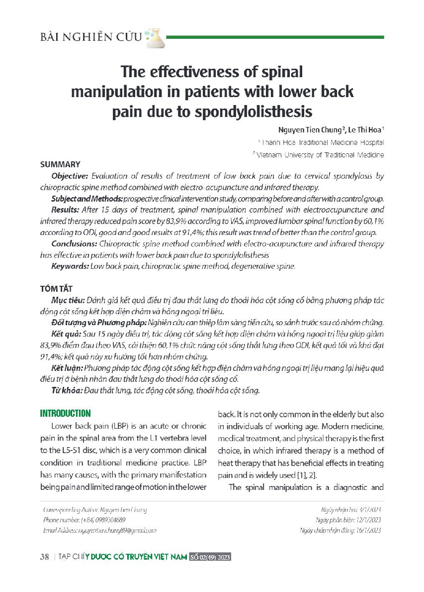 Hiệu quả của phương pháp nắn chỉnh cột sống trên bệnh nhân đau thắt lưng do trượt đốt sống = The effectiveness of spinal manipulation in patients with lower back pain due to spondylolisthesis
