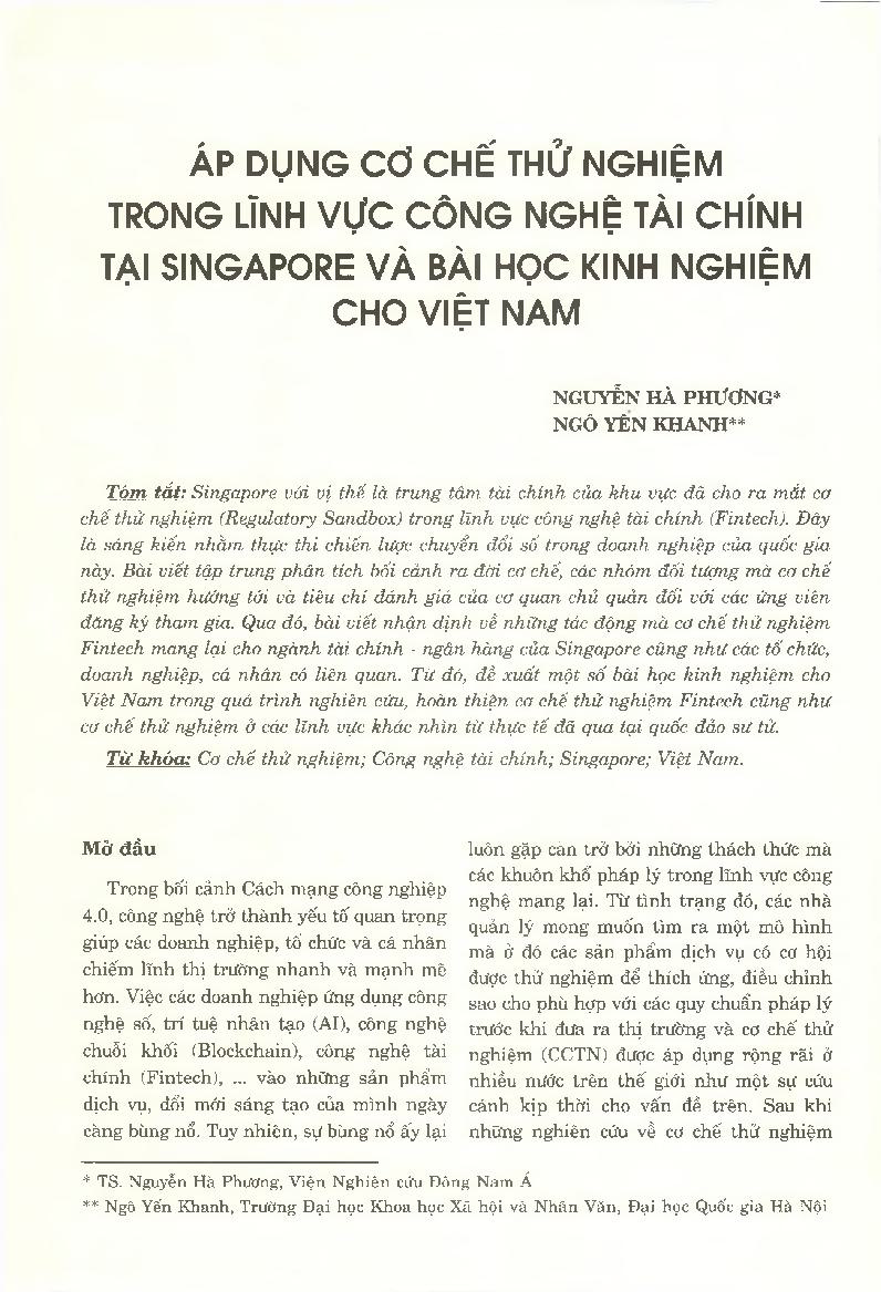 Áp dụng cơ chế thử nghiệm trong lĩnh vực công nghệ tài chính tại Singapore và bài học kinh nghiệm cho Việt Nam = Applying the Regulatory Sandbox in Financial Technology in Singapore: An Overview and Lessons Learned for Vietnam