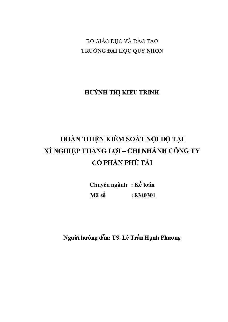 Hoàn thiện kiểm soát nội bộ tại Xí nghiệp Thắng Lợi - Chi nhánh Công ty Cổ phần Phú Tài
