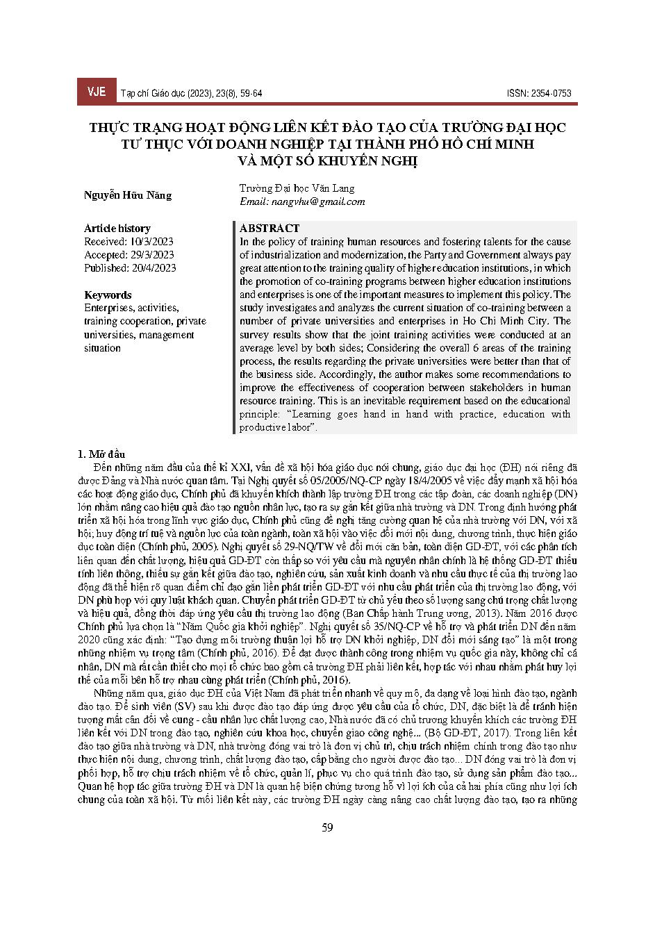 Thực trạng hoạt động liên kết đào tạo của trường đại học tư thục với doanh nghiệp tại Thành phố Hồ Chí Minh và một số khuyến nghị = Actual situation of joint training activities of private universities with enterprises in Ho Chi Minh City and some recomme