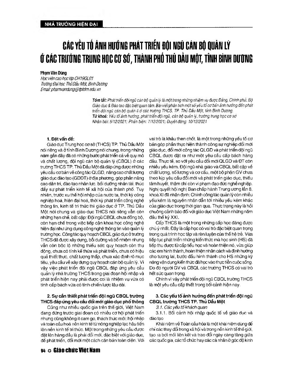 Các yếu tố ảnh hưởng phát triển đội ngũ cán bộ quản lý ở các trường trung học cơ sở, thành phố Thủ Dầu Một, tỉnh Bình Dương = Factors affecting tile development of management staff in the junior high schools, Thu Dau Mot city, Binh Duong province