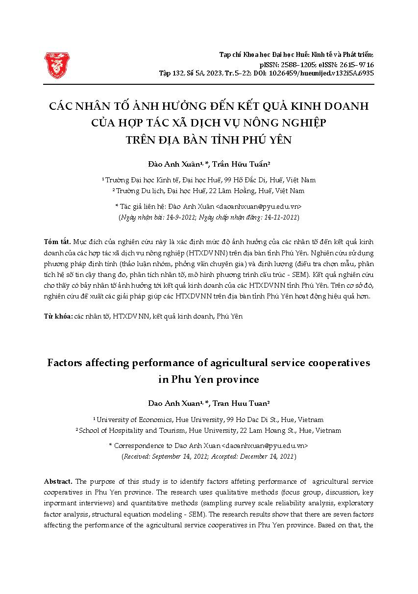 Các nhân tố ảnh hưởng đến kết quả kinh doanh của hợp tác xã dịch vụ nông nghiệp trên địa bàn tỉnh Phú Yên = Factors affecting performance of agricultural service cooperatives in Phu Yen province