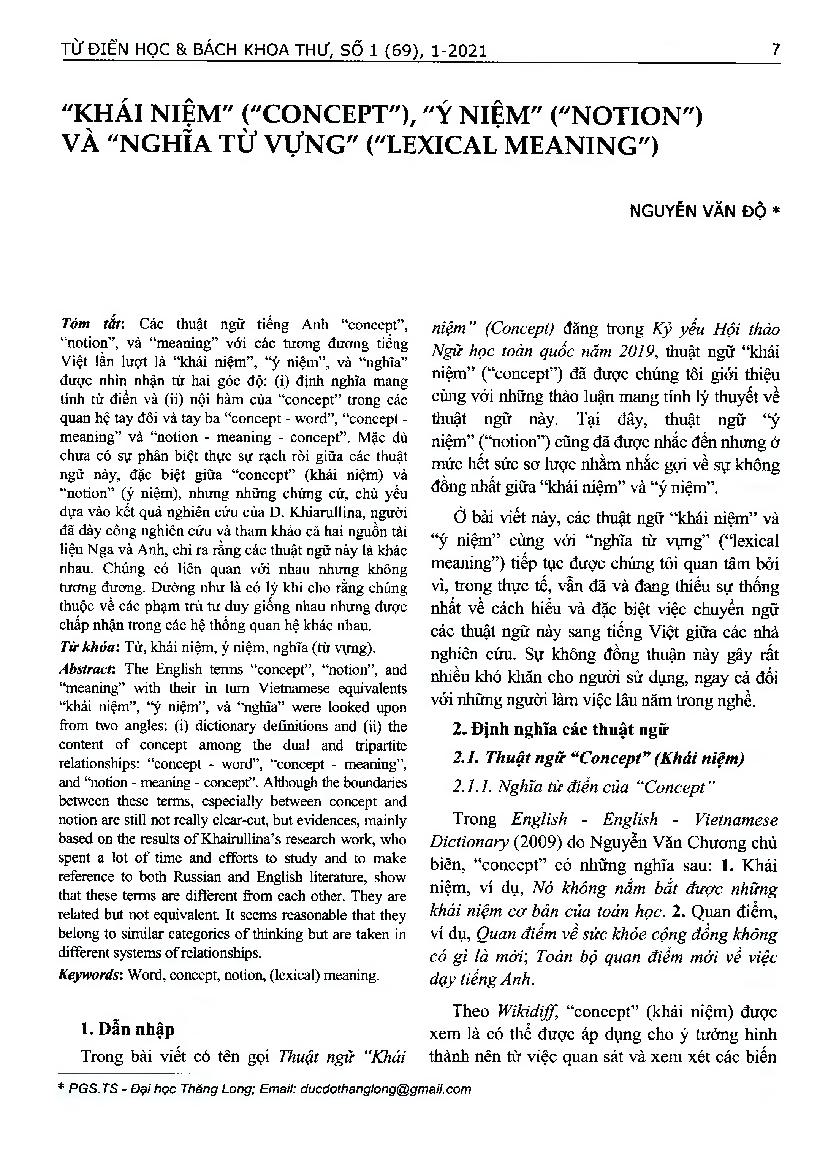 Khái niệm ("concept"), "ý niệm" ("notion") và "nghĩa từ vựng" ("lexical meaning") = Concept, Notion and Lexical meaning