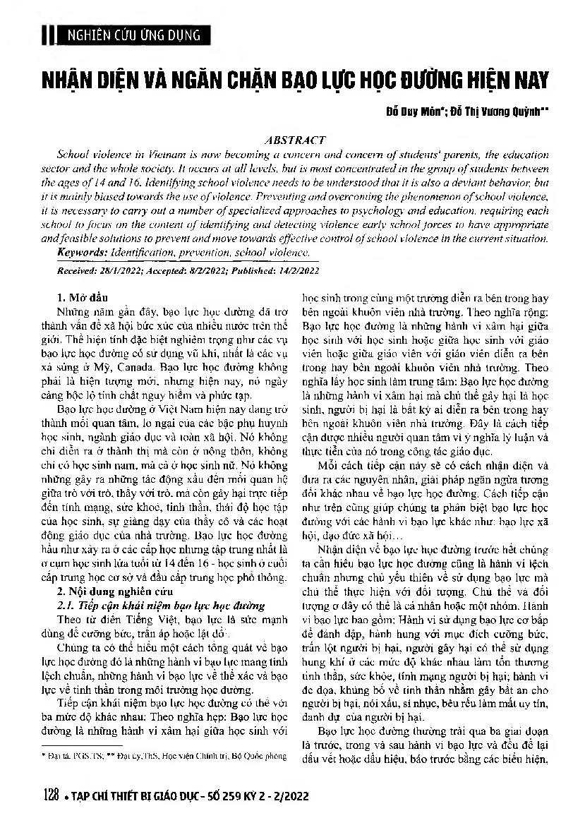 Nhận diện và ngăn chặn bạo lực học đường hiện nay = Identifying and preventing current 128 school violence