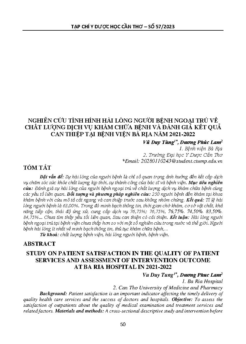 Nghiên cứu tình hình hài lòng người bệnh ngoại trú về chất lượng dịch vụ khám chữa bệnh và đánh giá kết quả can thiệp tại Bệnh viện Bà Rịa năm 2021-2022