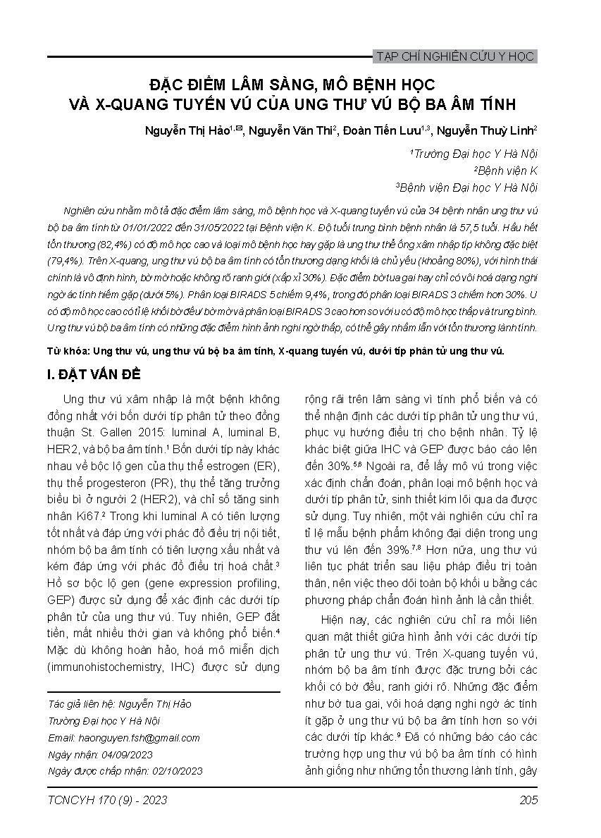 Đặc điểm lâm sàng, mô bệnh học và X-quang tuyến vú của ung thư vú bộ ba âm tính = Clinicopathological and mammographic features of the triple-negative breast cancer