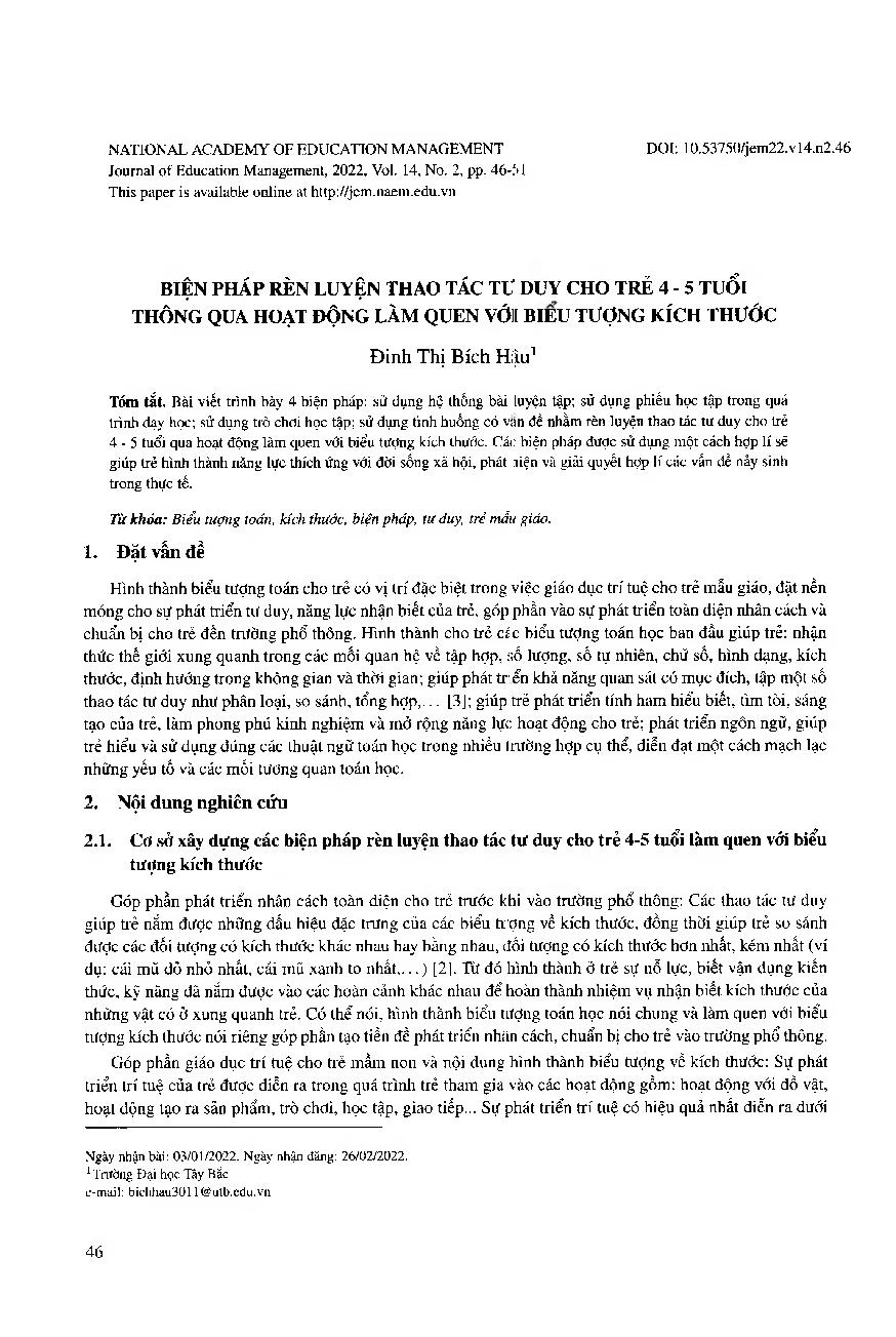 Biện pháp rèn luyện thao tác tư duy cho trẻ 4 - 5 tuổi thông qua hoạt động làm quen với biểu tượng kích thước = Methods for training thinking operations for 4 - 5 years old children through activities to become acquainted with sizes and symbols