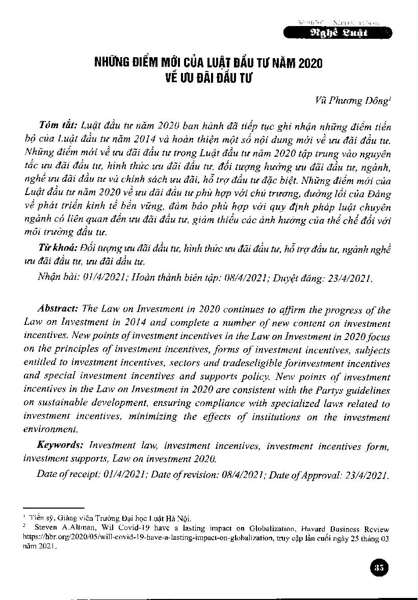 Những điểm mới của Luật đầu tư năm 2020 về ưu đãi đầu tư = New points of the Law on Investment in 2020 on investment incentive
