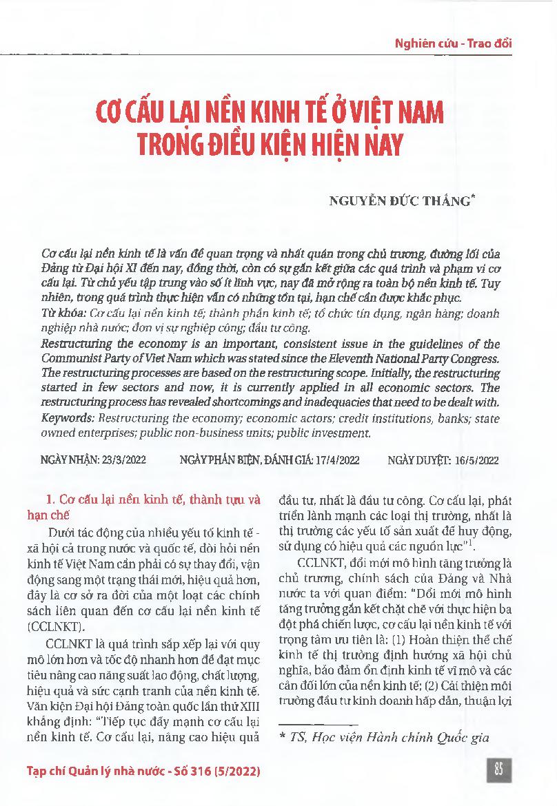 Cơ cấu lại nền kinh tế ở Việt Nam trong điều kiện hiện nay = Restructuring the economy in Viet Nam in the current context