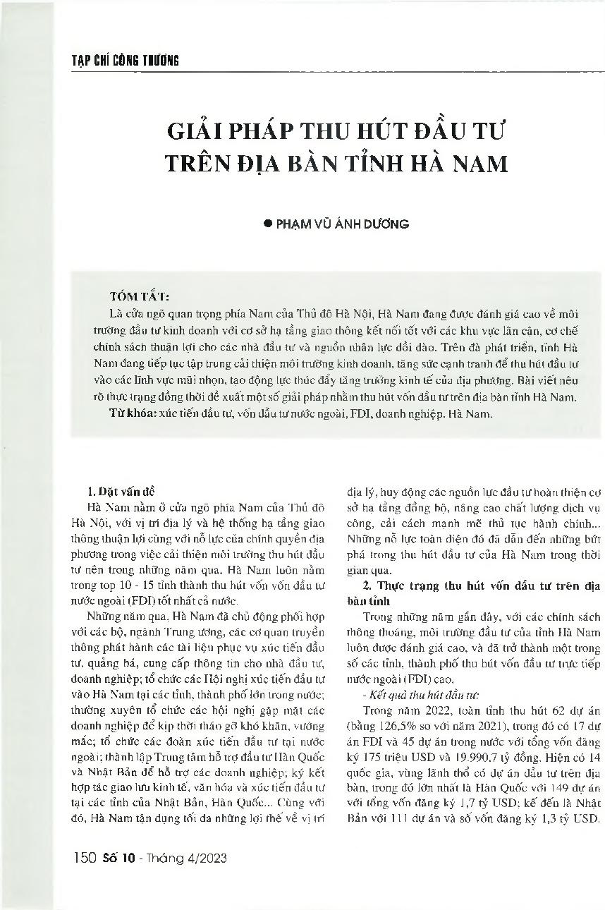 Giải pháp thu hút đầu tư trên địa bàn tỉnh Hà Nam