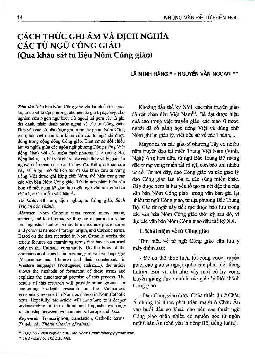 Cách thức ghi âm và dịch nghĩa các từ ngữ Công giáo (qua khảo sát tư liệu Nôm Công giáo) = Methods of transcribing and translating Nom Catholic terms (based on a survey on Nom Catholic materials)