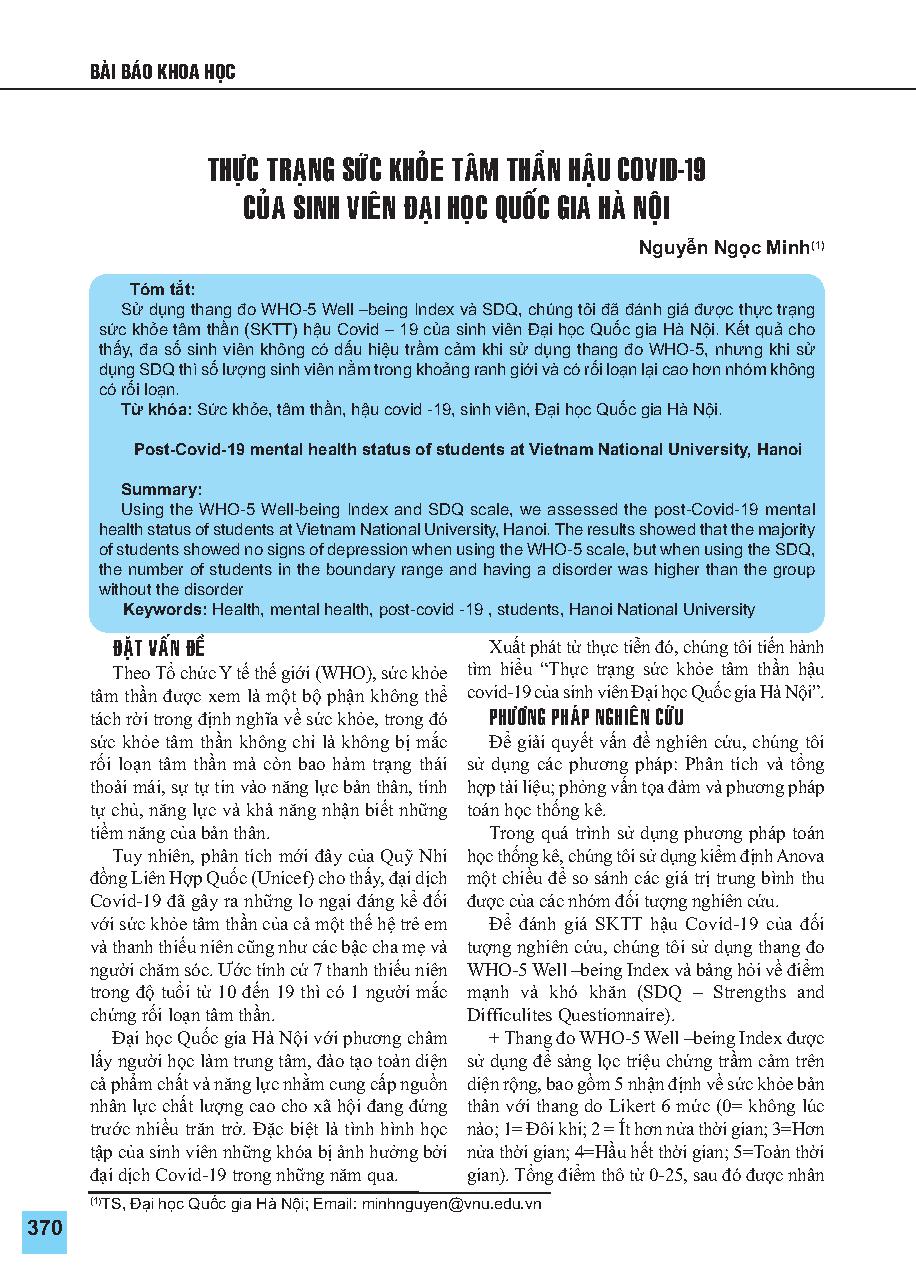 Thực trạng sức khỏe tâm thần hậu Covid-19 của sinh viên Đại học Quốc gia Hà Nội = Post-Covid-19 mental health status of students at Vietnam National University, Hanoi