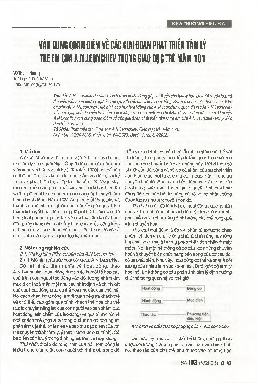 Vận dụng quan điểm về các giai đoạn phát triển tâm lý trẻ em của A. N. Leonchiev trong giáo dục trẻ mầm non = Using the perspective on the stages of child psychological development by A. N. Leonchiev in the education of preschool children