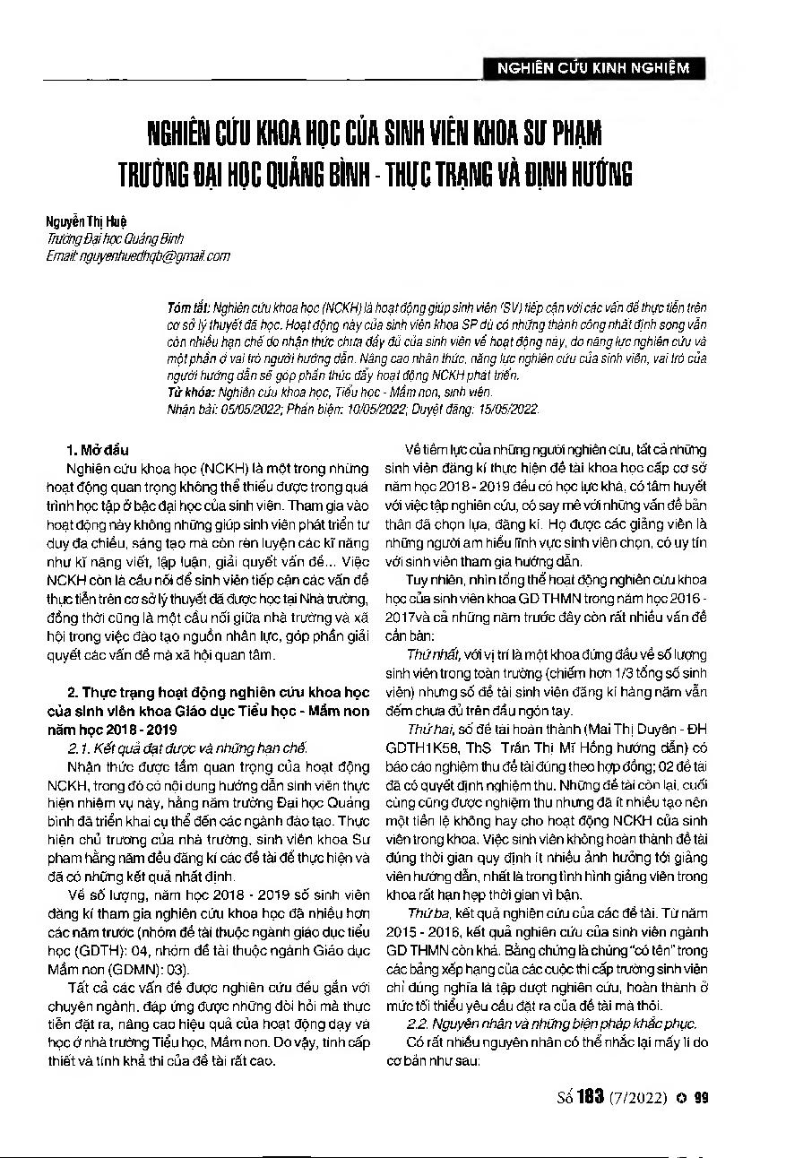 Nghiên cứu khoa học của sinh viên khoa Sư phạm trường Đại học Quảng Bình - Thực trạng và định hướng = Scientific research by the students at the Faculty of Pedagogy Quang Binh University - Reality and orientation