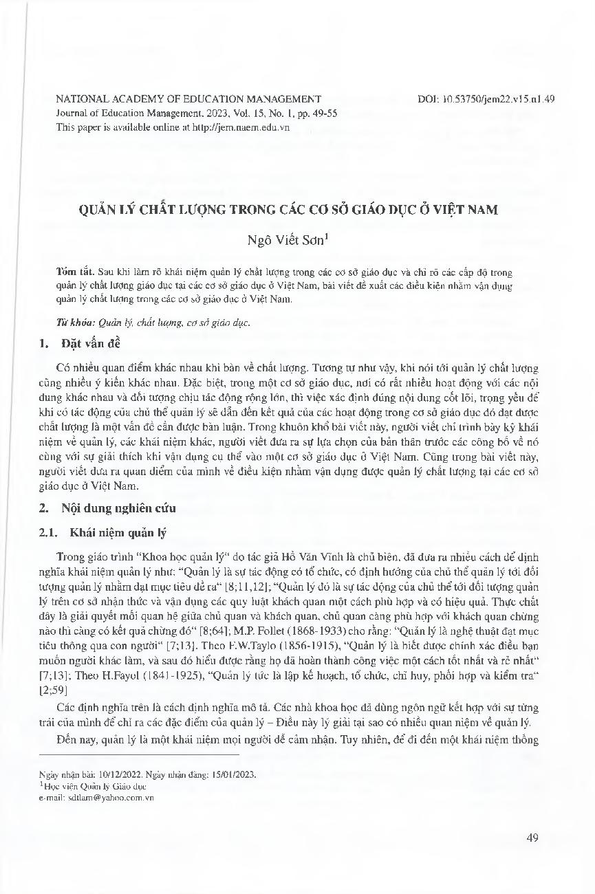 Quản lý chất lượng trong các cơ sở giáo dục ở Việt Nam = Quality management in educational institutions in Vietnam