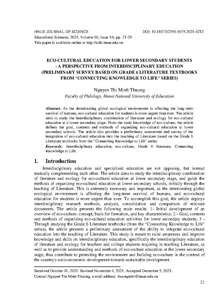 Giáo dục văn hóa sinh thái cho học sinh THCS - góc nhìn từ giáo dục liên môn (khảo sát sơ bộ theo SGK ngữ văn lớp 6 từ bộ sách “Nối kiến thức với cuộc sống”) = Eco-cultural education for lower secondary students - a perspective from interdisciplinary education (preliminary survey based on grade 6 literature textbooks from “connecting knowledge to life” series)