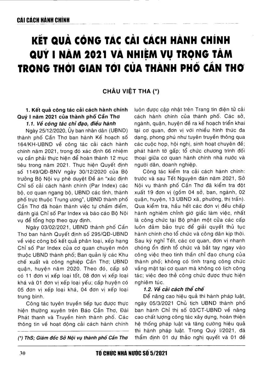 Kết quả công tác cải cách hành chính quý I năm 2021 vá nhiệm vụ trọng tâm trong thời gian tới của thành phố Cần Thơ
