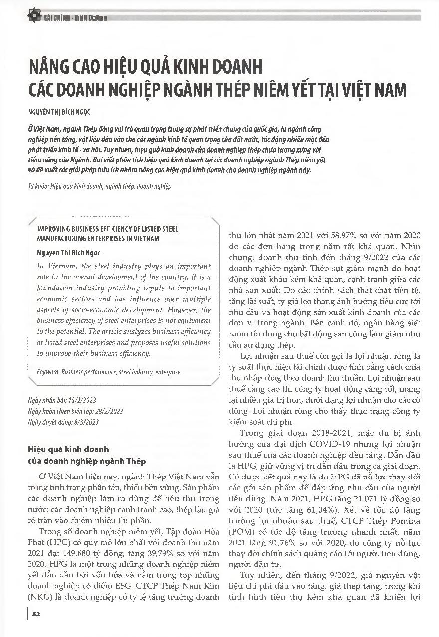Nâng cao hiệu quả kinh doanh các doanh nghiệp ngành Thép niêm yết tại Việt Nam = Improving business efficiency of listed steel manufacturing enterprises in Vietnam