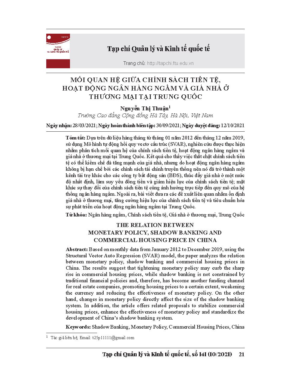 Mối quan hệ giữa chính sách tiền tệ, hoạt động ngân hàng ngầm và giá nhà ở thương mại tại Trung Quốc = The relation between monetary policy, shadow banking and commercial housing price in China