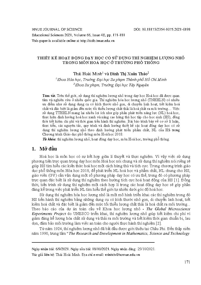 Thiết kế hoạt động dạy học có sử dụng thí nghiệm lượng nhỏ trong môn hoá học ở trường phổ thông = Design learning activities using microscale experiment in teaching Chemistry at High schools