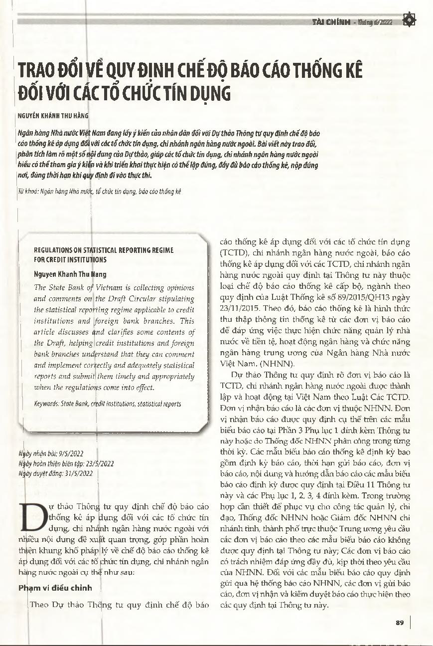 Trao đổi vé quy định chế độ báo cáo thống kê đối với các tổ chức tín dụng = Regulations on statistical reporting regime for credit institutions