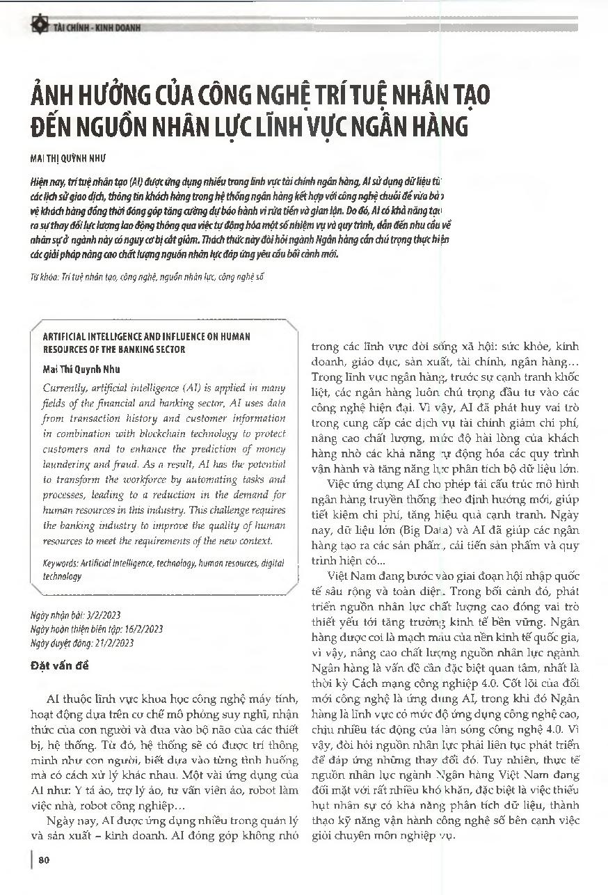 Ảnh hưởng của công nghệ trí tuệ nhân tạo đến nguồn nhân lực lĩnh vực ngân hàng = Artificial intelligence and influence on human resources of the banking sector