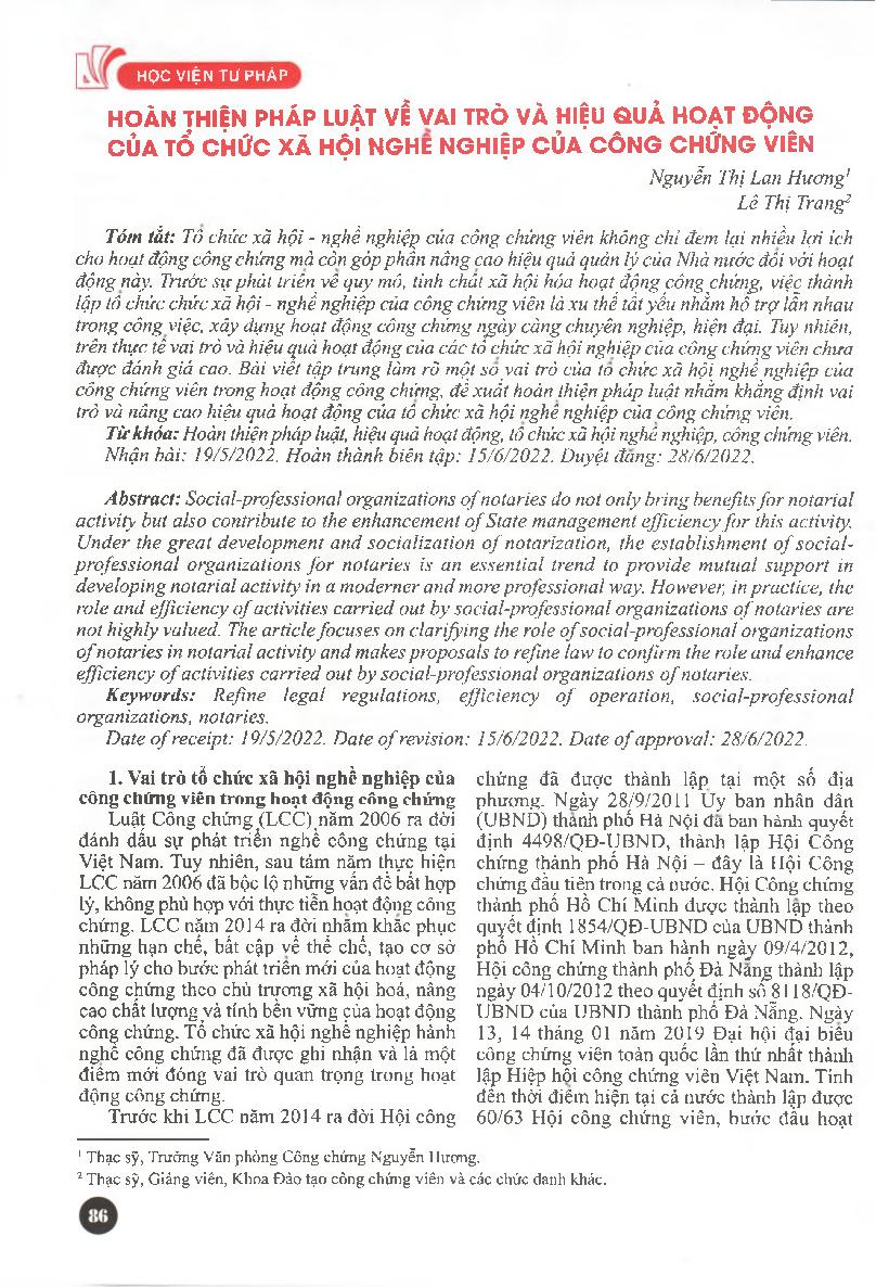 Hoàn thiện pháp luật về vai trò và hiệu quả hoạt động của tổ chức xã hội nghề nghiệp cùa công chứng viên = Finalizing legal regulations on the role and operation efficiency for professional social organization of notaries