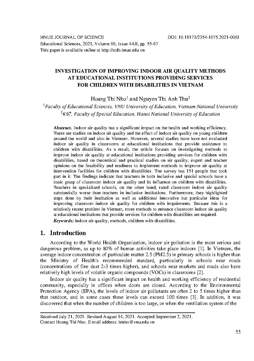 Điều tra các phương pháp cải thiện chất lượng không khí trong nhà tại các cơ sở giáo dục cung cấp dịch vụ cho trẻ khuyết tật ở Việt Nam = Investigation of improving indoor air quality methods at educational institutions providing services for children with disabilities in Vietnam