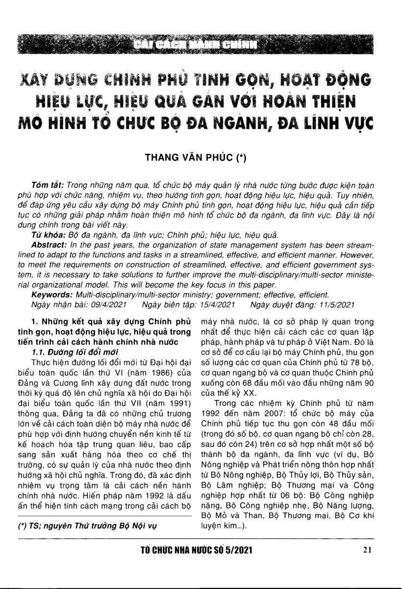 Xây dựng Chính phủ tinh gọn, hoạt động hiệu lực, hiệu quả gắn với hoàn thiện mô hình tổ chức bộ đa ngành, đa lĩnh vực
