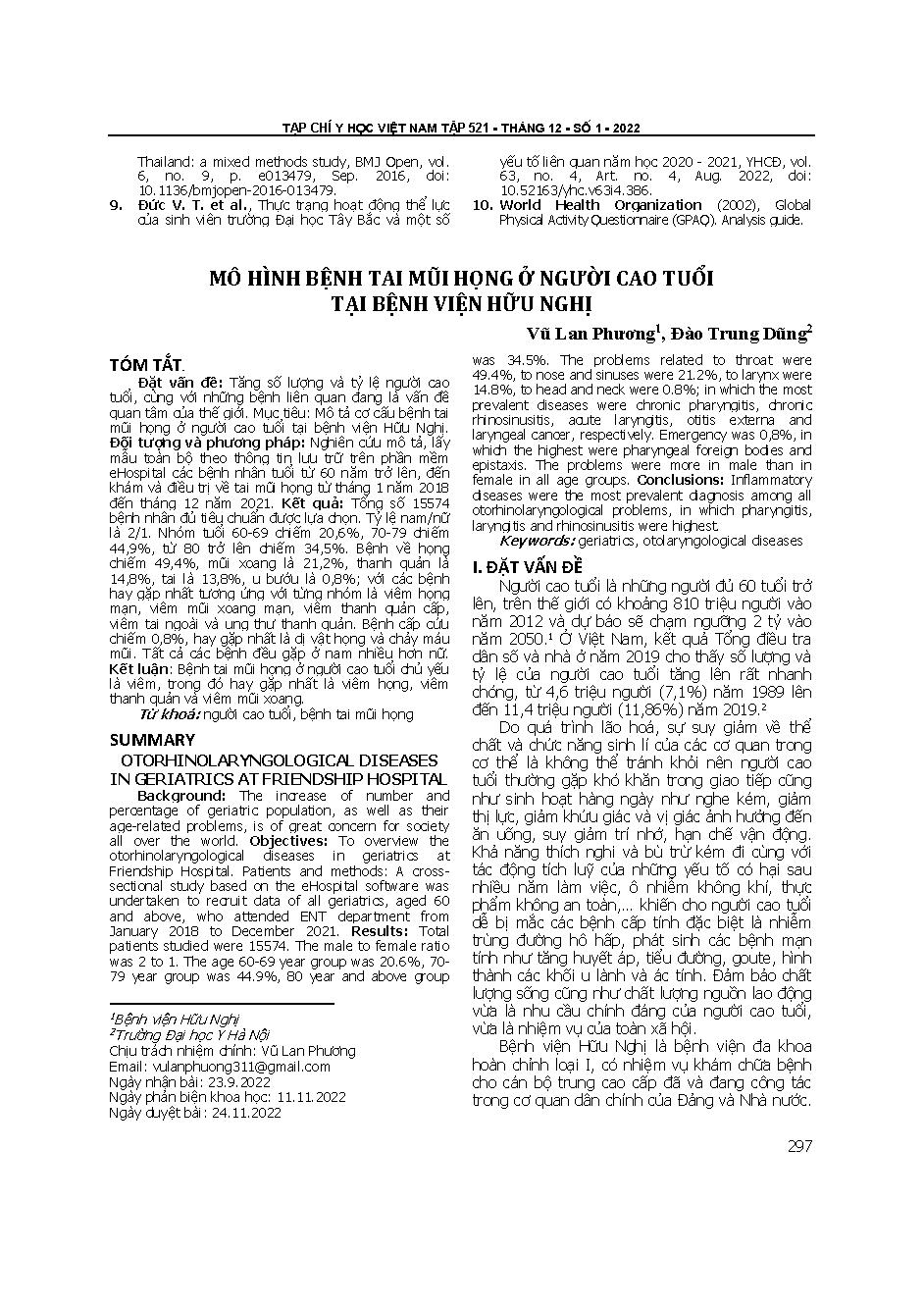 Mô hình bệnh tai mũi họng ở người cao tuổi tại Bệnh viện Hữu Nghị = Otorhinolaryngological diseases in geriatrics at friendship hospital