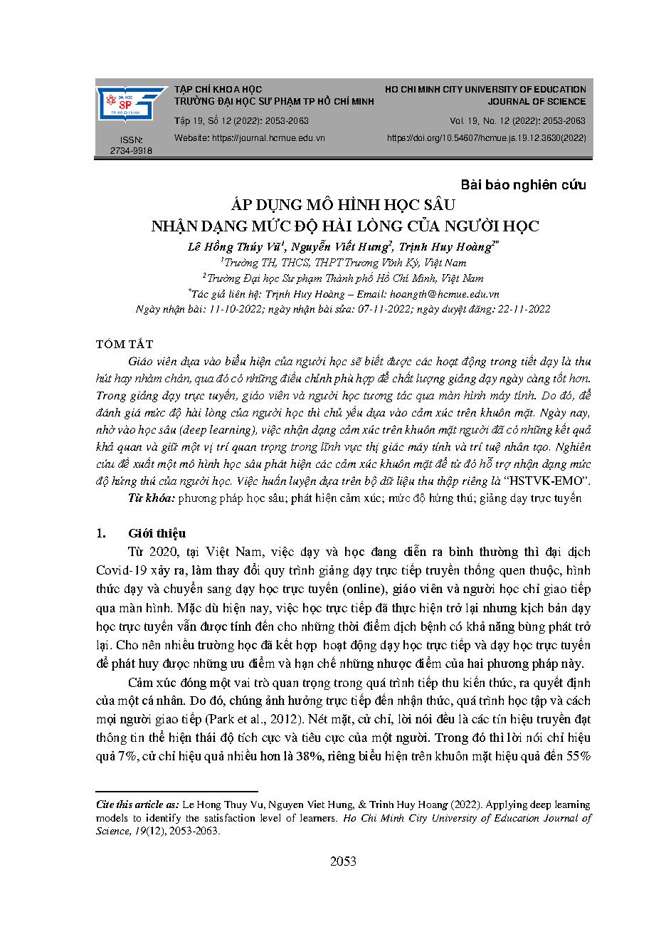 Áp dụng mô hình học sâu nhận dạng mức độ hài lòng của người học = Applying deep learning models to identify the satisfaction level of learners