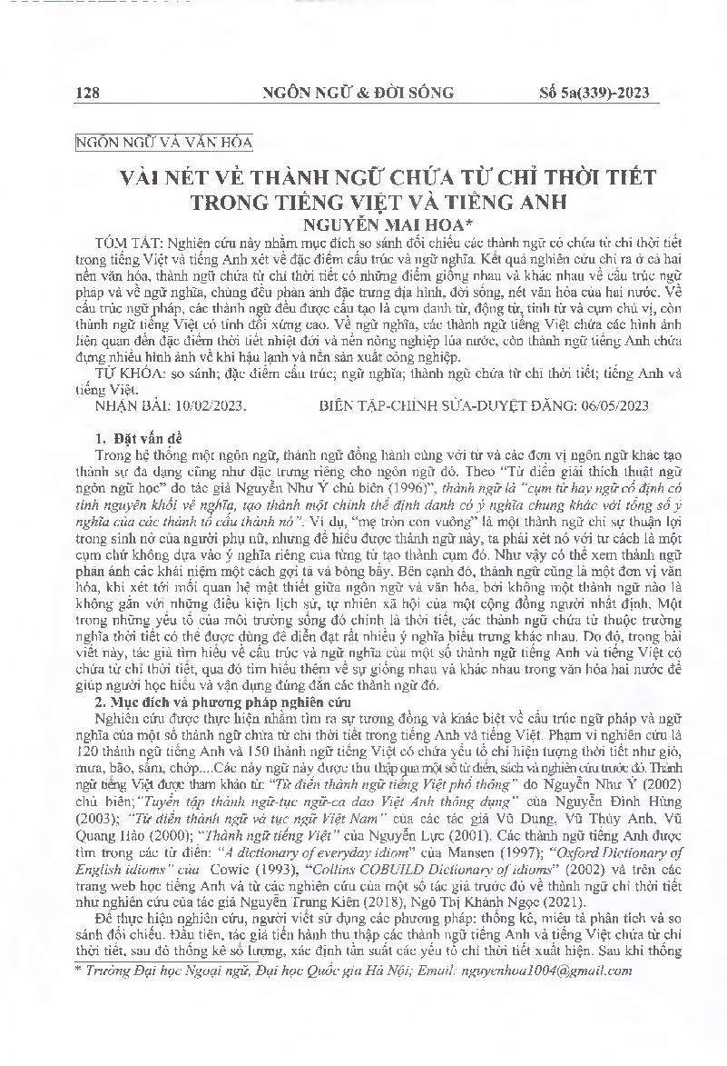 Vài nét về thành ngữ chứa từ chỉ thời tiết trong tiếng Việt và tiếng Anh = Some features of English and Vietnamese idioms contaning words denoting weather