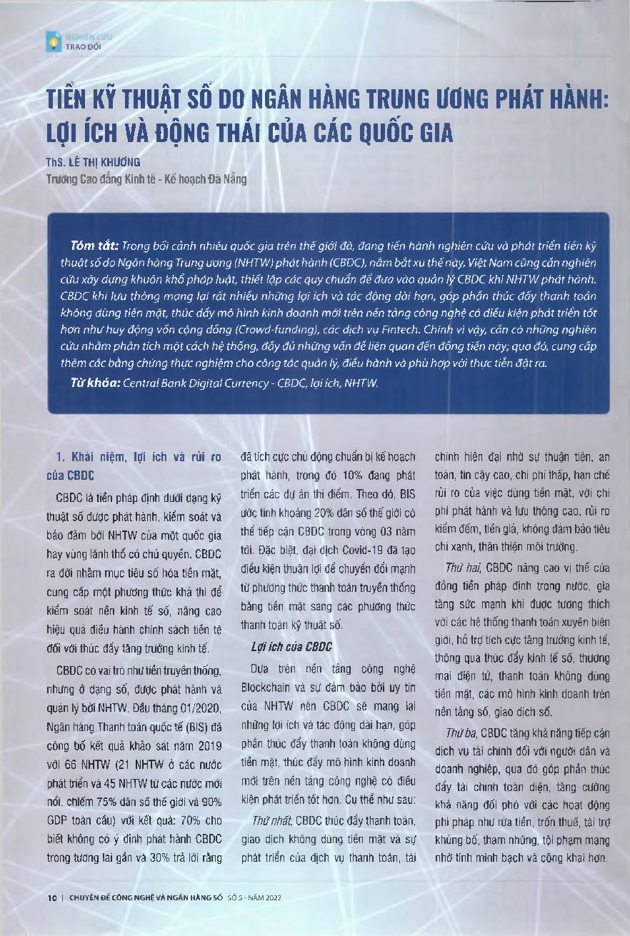 Tiền kỹ thuật số do ngân hàng Trung ương phát hành: Lợi ích và động thái của các quốc gia = Central bank-issued digital currencies: The benefits and moves of countries