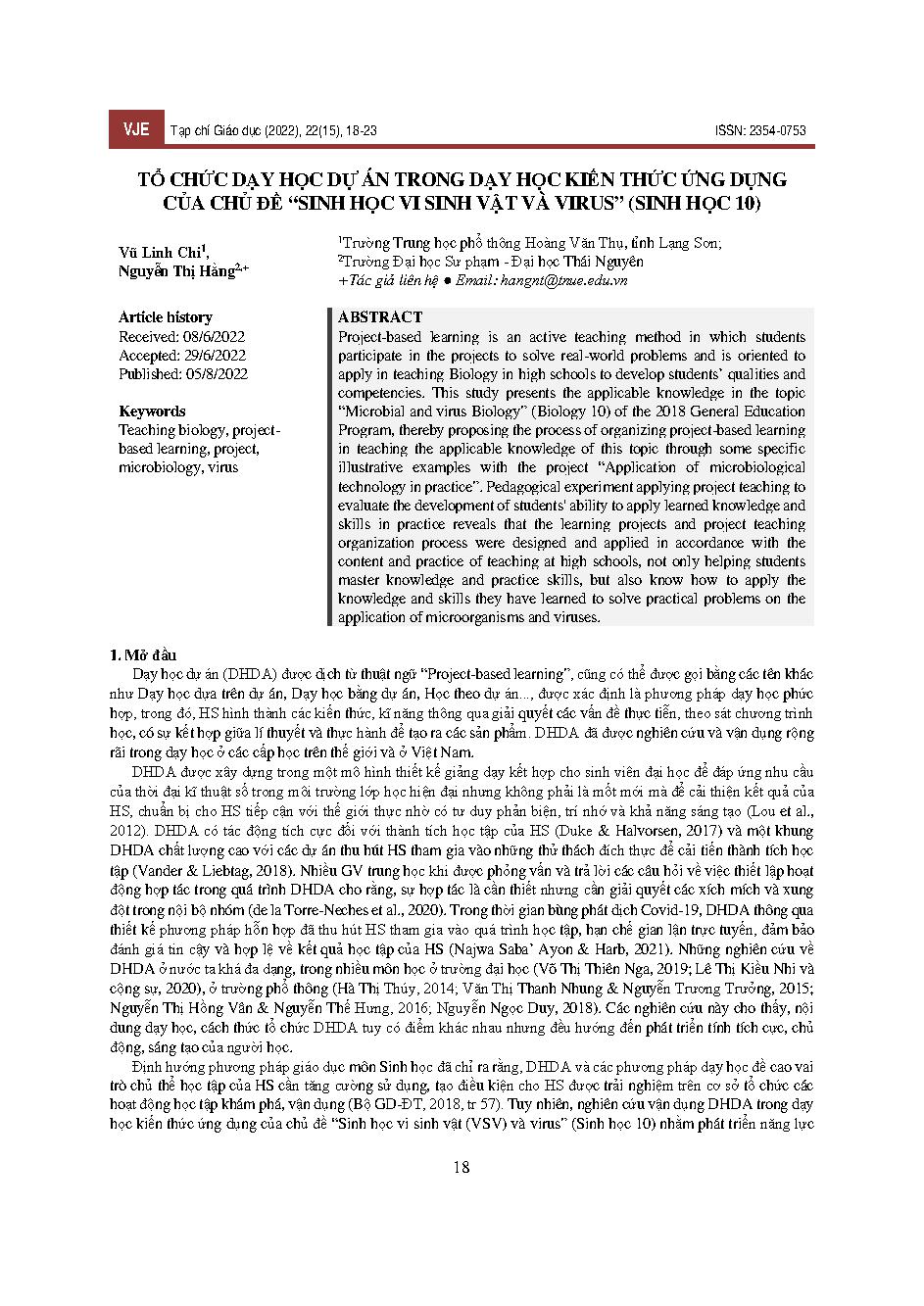 Tổ chức dạy học dự án trong dạy học kiến thức ứng dụng của chủ đề “sinh học vi sinh vật và virus” (sinh học 10) = Organizing project teaching in teaching applied knowledge of the topic "microbiology of microorganisms and viruses" (biology 10)