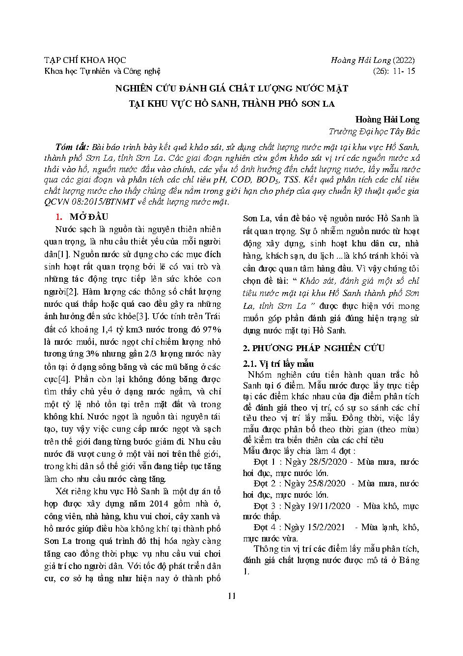 Nghiên cứu đánh giá chất lượng nước mặt tại khu vực hồ Sanh, thành phố Sơn La = Research and assessment of surface water quality in Ho Sanh lake area, Son La city