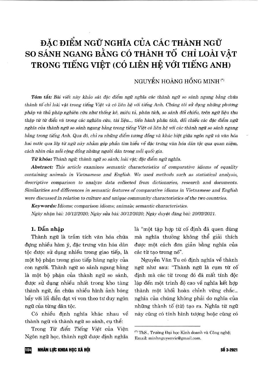 Đặc điểm ngữ nghĩa của các thành ngữ so sánh ngang bằng chứa thành tố chỉ loài vật trong tiếng Việt (có liên hệ với tiếng Anh) = Semantic features of comparative idioms of equality containing animalsinVietnameseand English