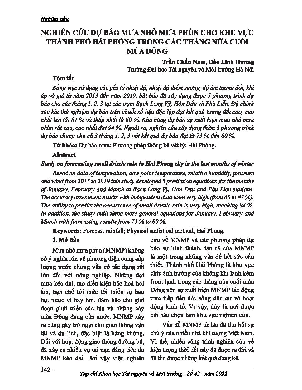 Nghiên cứu dự báo mưa nhỏ mưa phùn cho khu vực thành phố Hải Phòng trong các tháng nửa cuối mùa đông = Study on forecasting small drizzle rain in Hai Phong city in the last months of winter