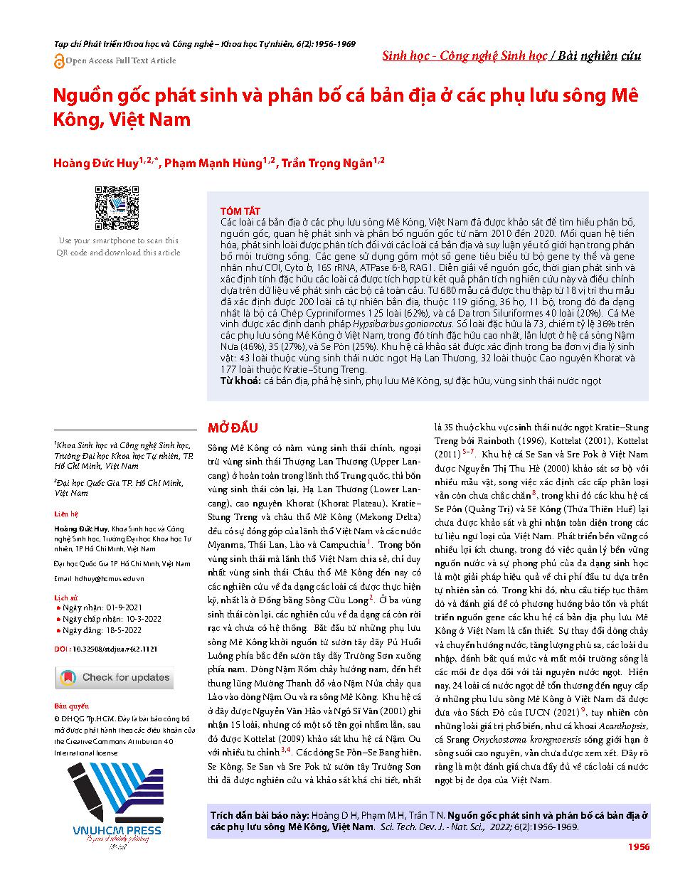 Nguồn gốc phát sinh và phân bố cá bản địa ở các phụ lưu sông Mê Kông, Việt Nam = The phylogenetic relationship and distribution of indigenous freshwater fishes in the Mekong tributaries, Vietnam