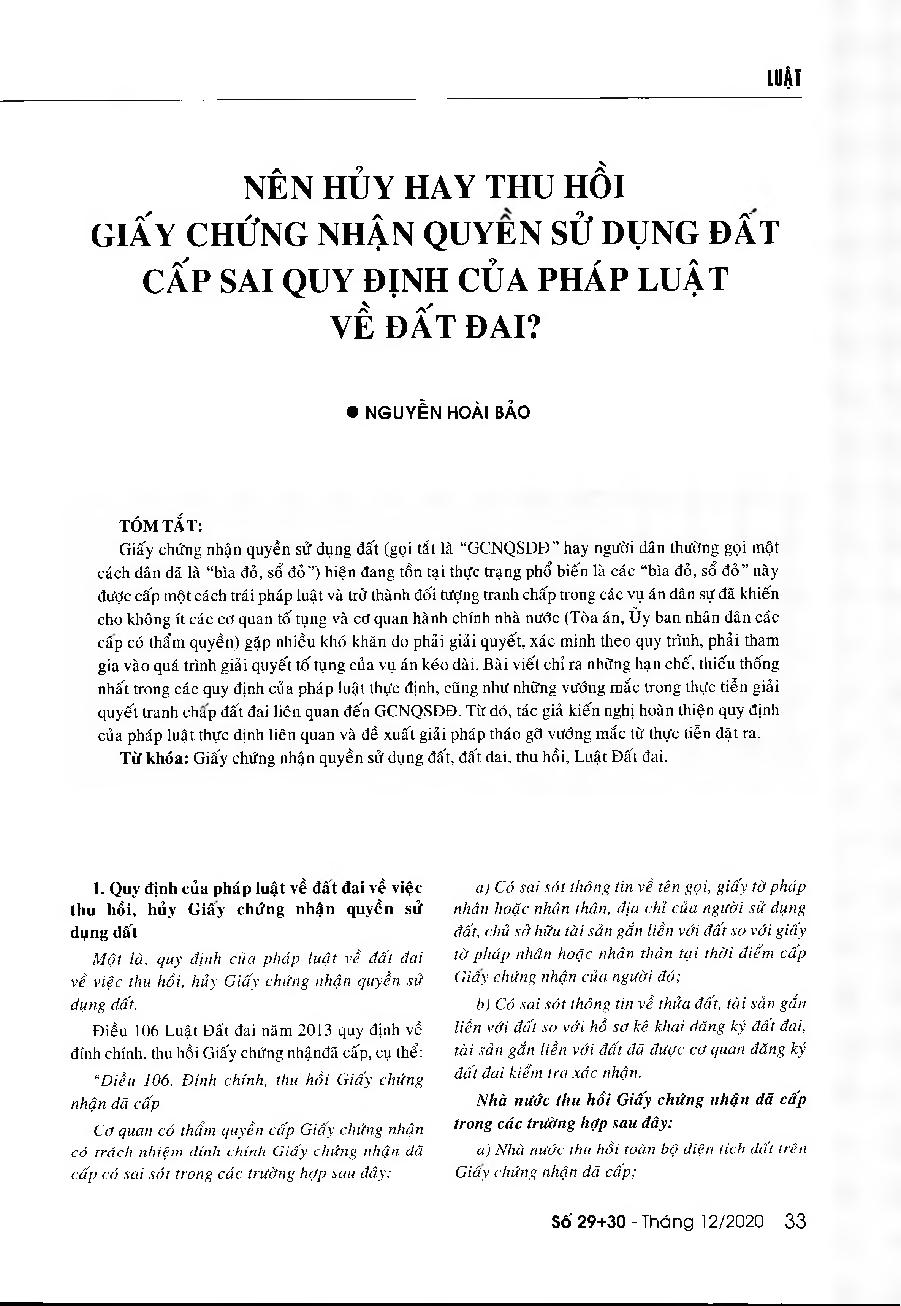 Nên hủy hay thu hồi giấy chứng nhận quyền sử dụng đất cấp sai quy định của pháp luật về đất đai? = Disputes of certificates of land use rights which are illegally granted