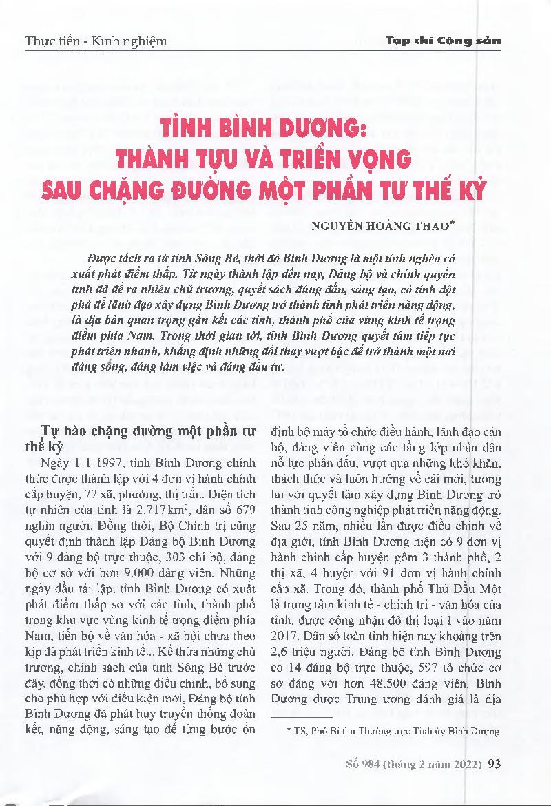 Tỉnh Bình Dương: Thành tựu và triển vọng sau chặng đường một phần tư thế kỷ = Binh Duong province: Achievements and prospects after a quarter of a century