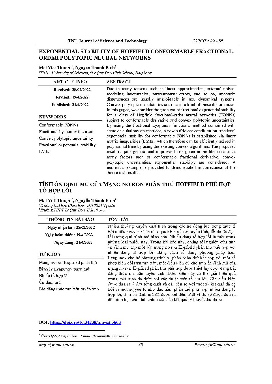 Tính ổn định mũ của mạng nơ ron phân thứ hopfield phù hợp tổ hợp lồi = Exponential stability of hopfield conformable fractional- order polytopic neural networks