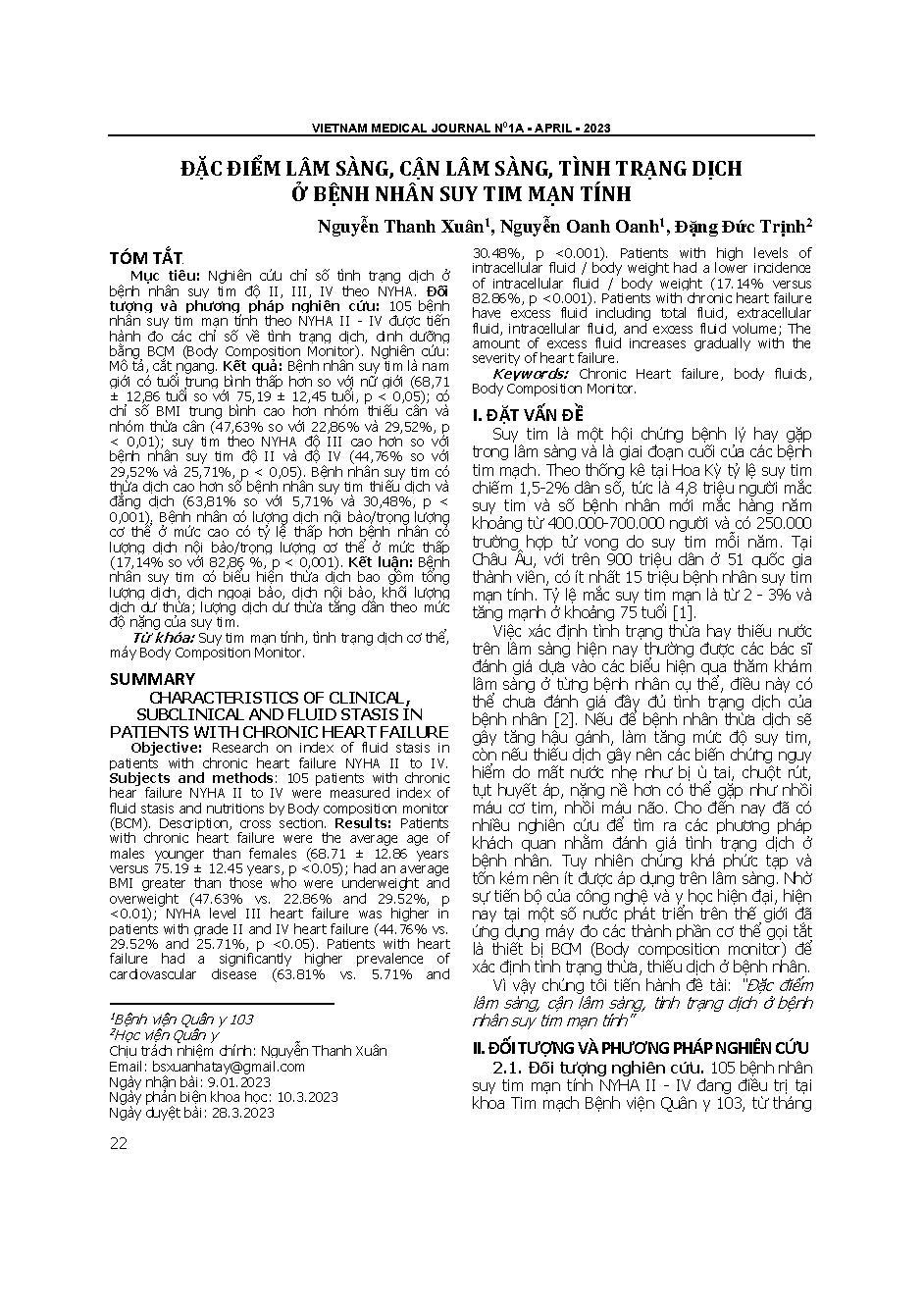 Đặc điểm lâm sàng, cận lâm sàng, tình trạng dịch ở bệnh nhân suy tim mạn tính = Characteristics of clinical, subclinical and fluid stasis in patients with chronic heart failure