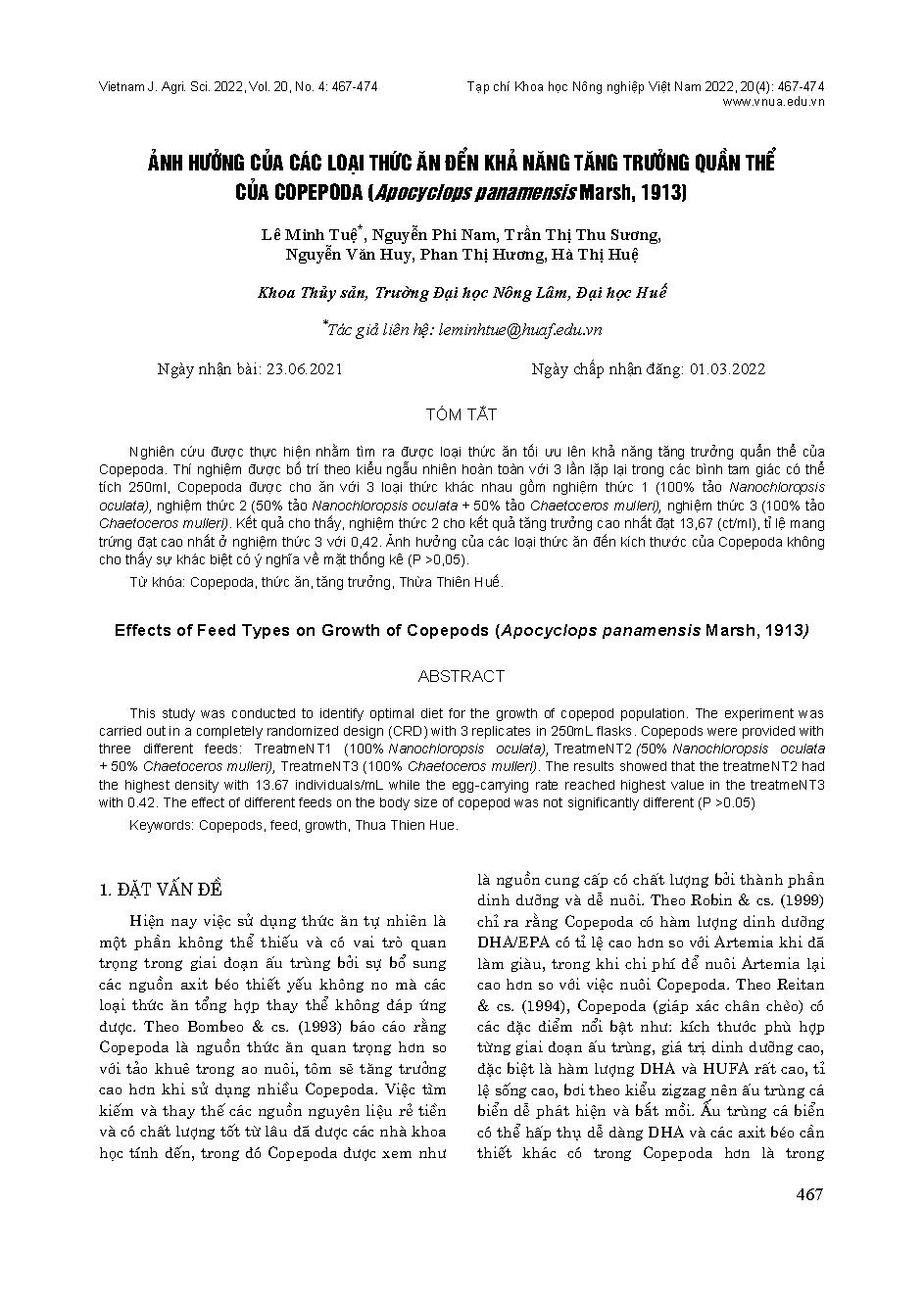 Ảnh hưởng của các loại thức ăn đến khả năng tăng trưởng quần thể của copepoda (Apocyclops panamensis Marsh, 1913) = Effects of feed types on growth of copepods (Apocyclops panamensis Marsh, 1913)