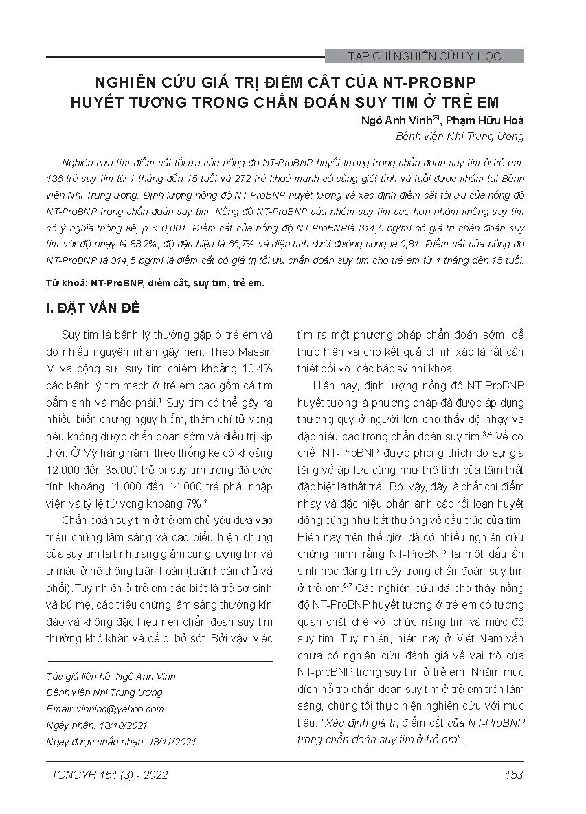 Nghiên cứu giá trị điểm cắt của NT-ProBNP huyết tương trong chẩn đoán suy tim ở trẻ em
