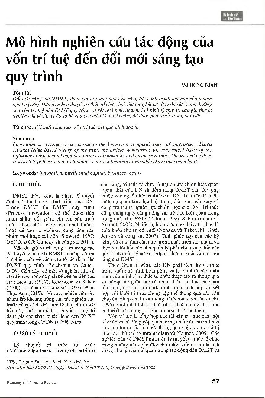 Mô hình nghiên cứu tác động của vốn trí tuệ đến đổi mới sáng tạo quy trình = A theoretical model on the impact of intellectual capital on process innovation