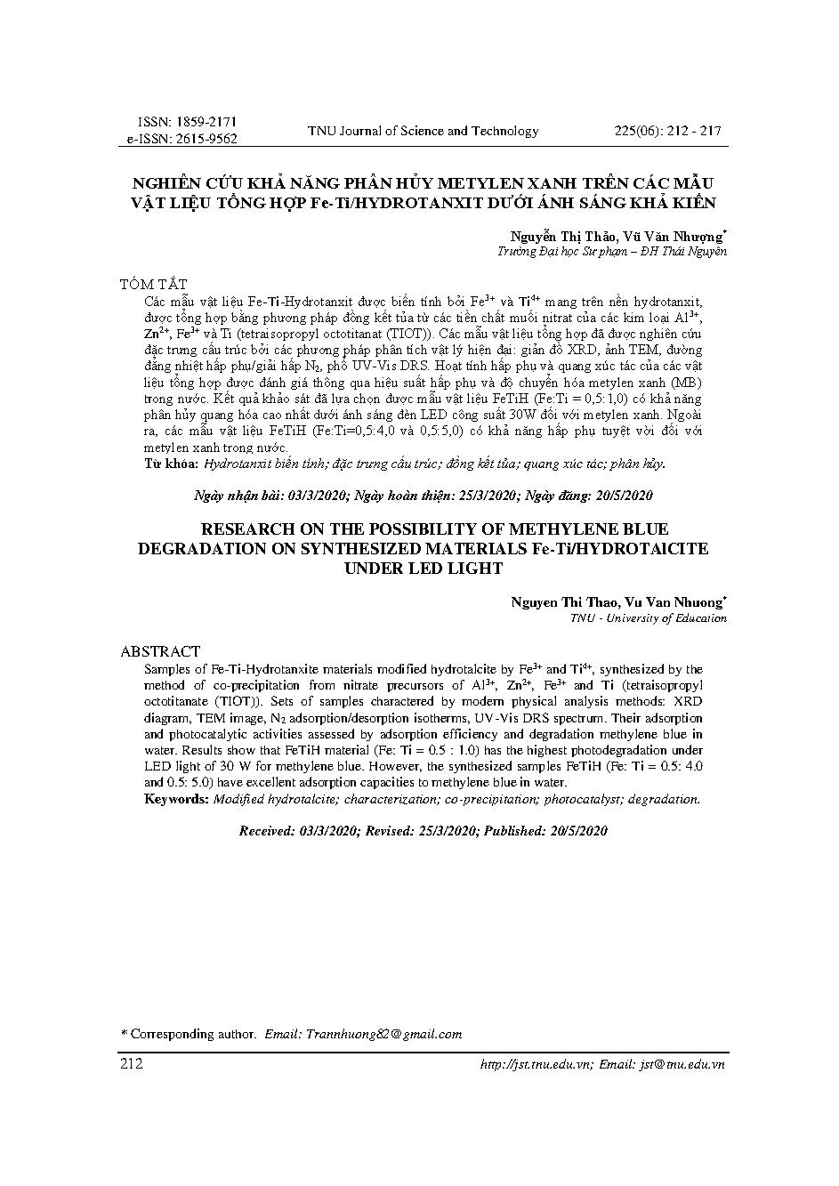 Nghiên cứu khả năng phân hủy metylen xanh trên các mẫu vật liệu tổng hợp Fe-Ti/Hydrotanxit dưới ánh sáng khả kiến = Research on the possibility of methylene blue degradation on synthesized materials Fe-Ti/Hydrotalcite under led light