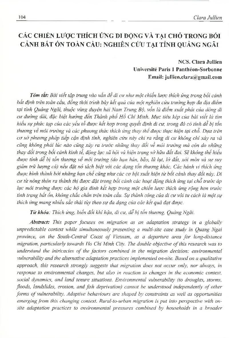 Các chiến lược thích ứng di động và tại chỗ trong bối cảnh bất ổn toàn cầu: Nghiên cứu tại tỉnh Quảng Ngãi = The Role of Elites in Promoting People's Disaster Response Capacity in Truong Xuan Commune, Quang Ninh District, Quang Binh Province